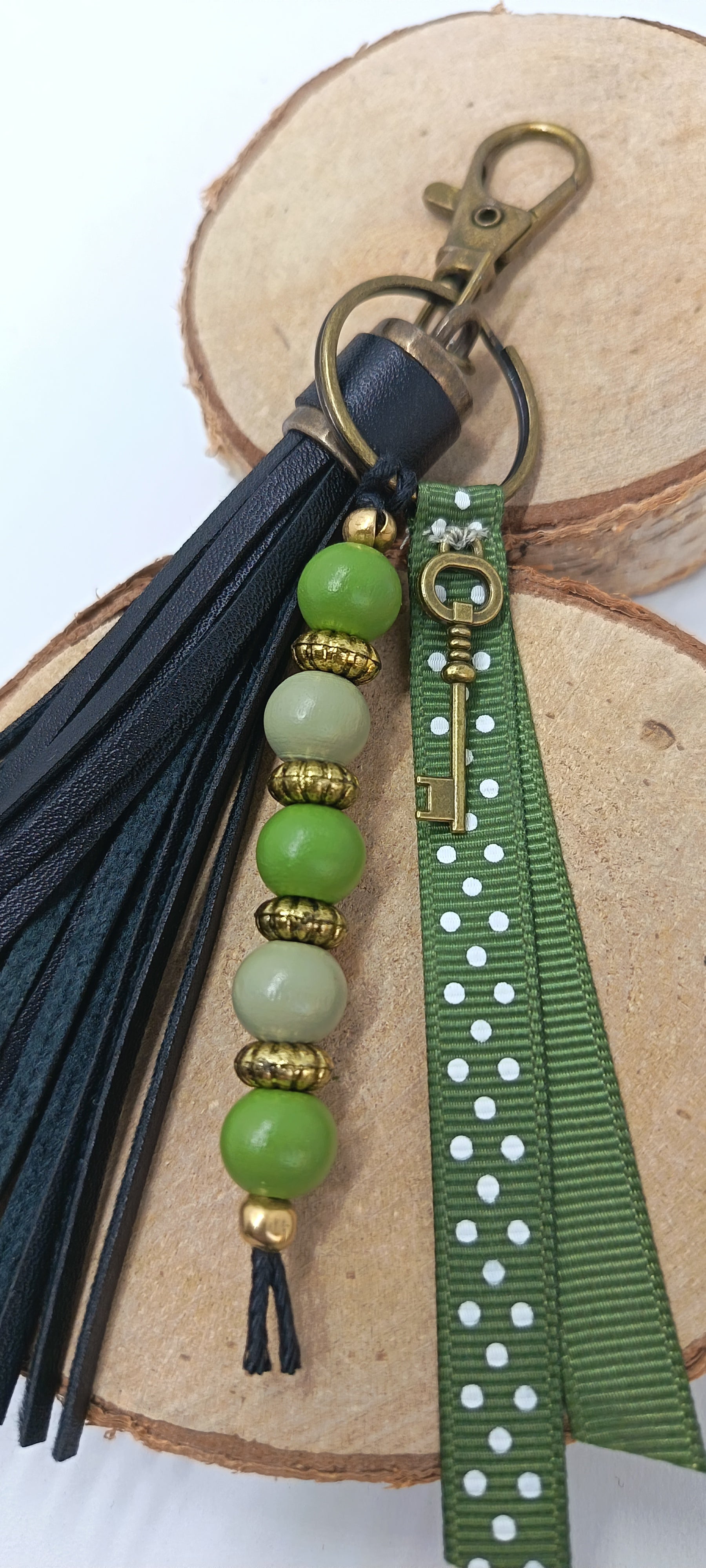 Fabrication artisanale et création unique pour ce bijou de sac porte clé avec pompon noir en cuir synthétique, perles de bois, ruban kaki à pois blanc et breloque clé en acier inoxydable bronze